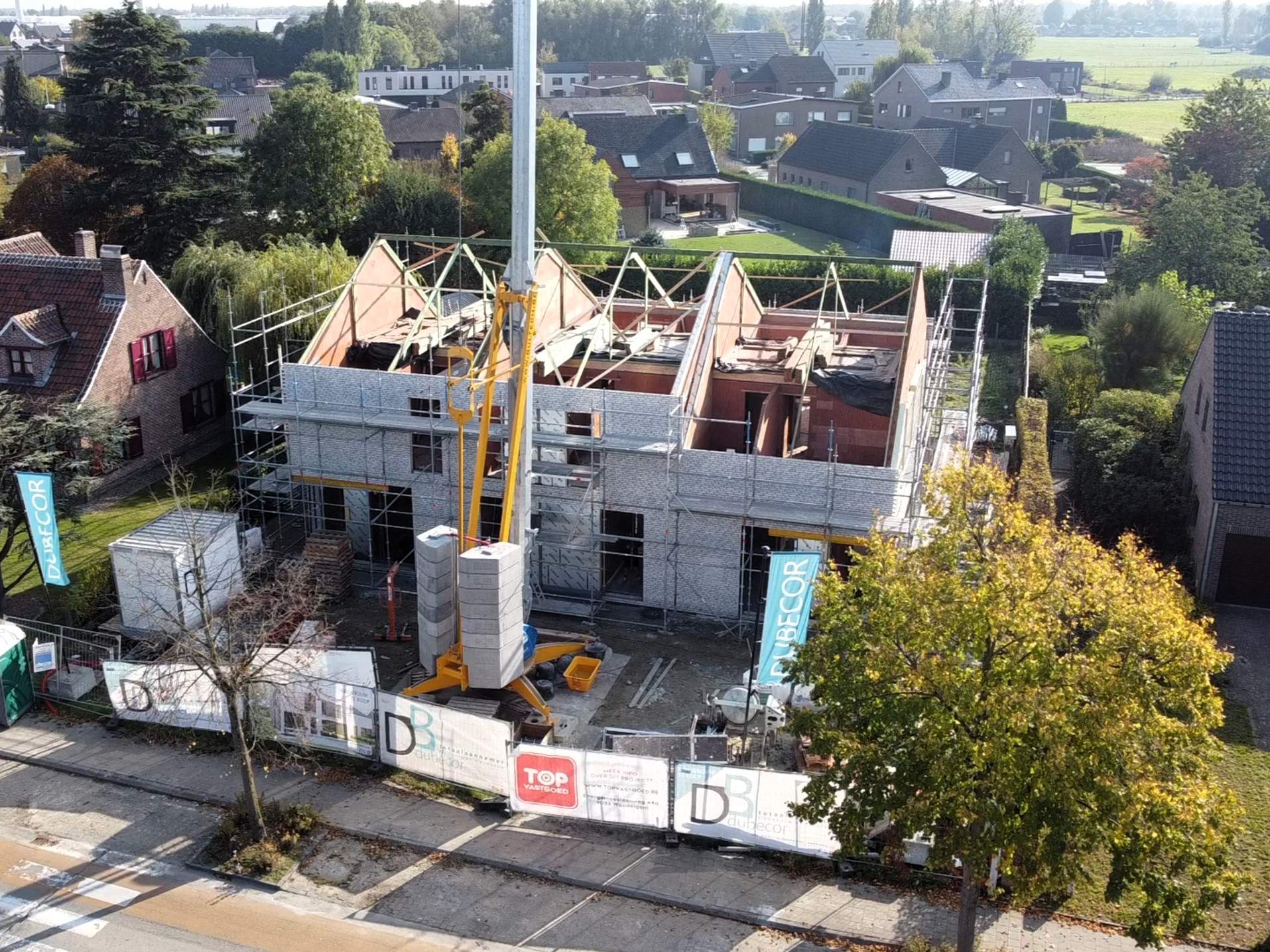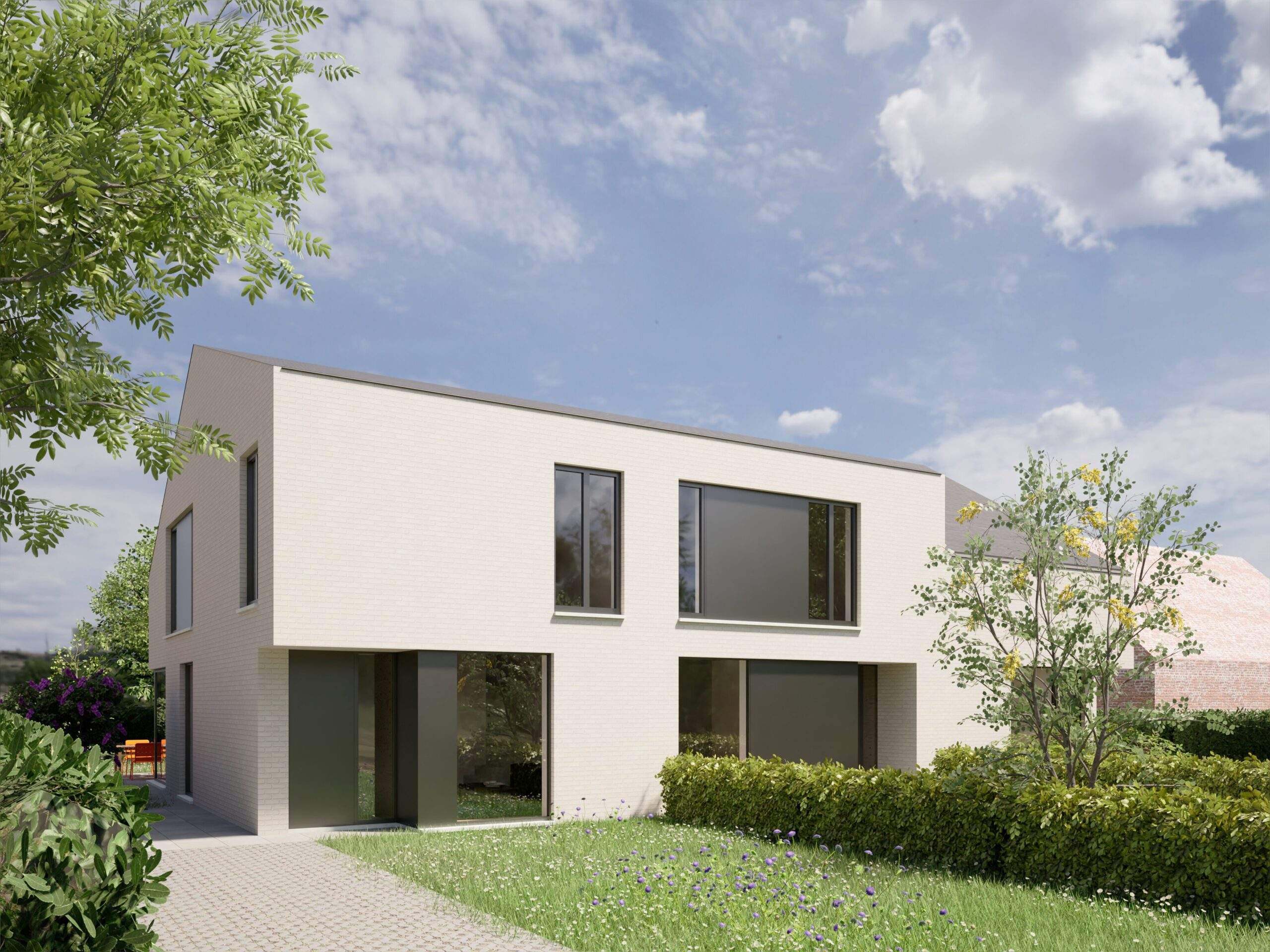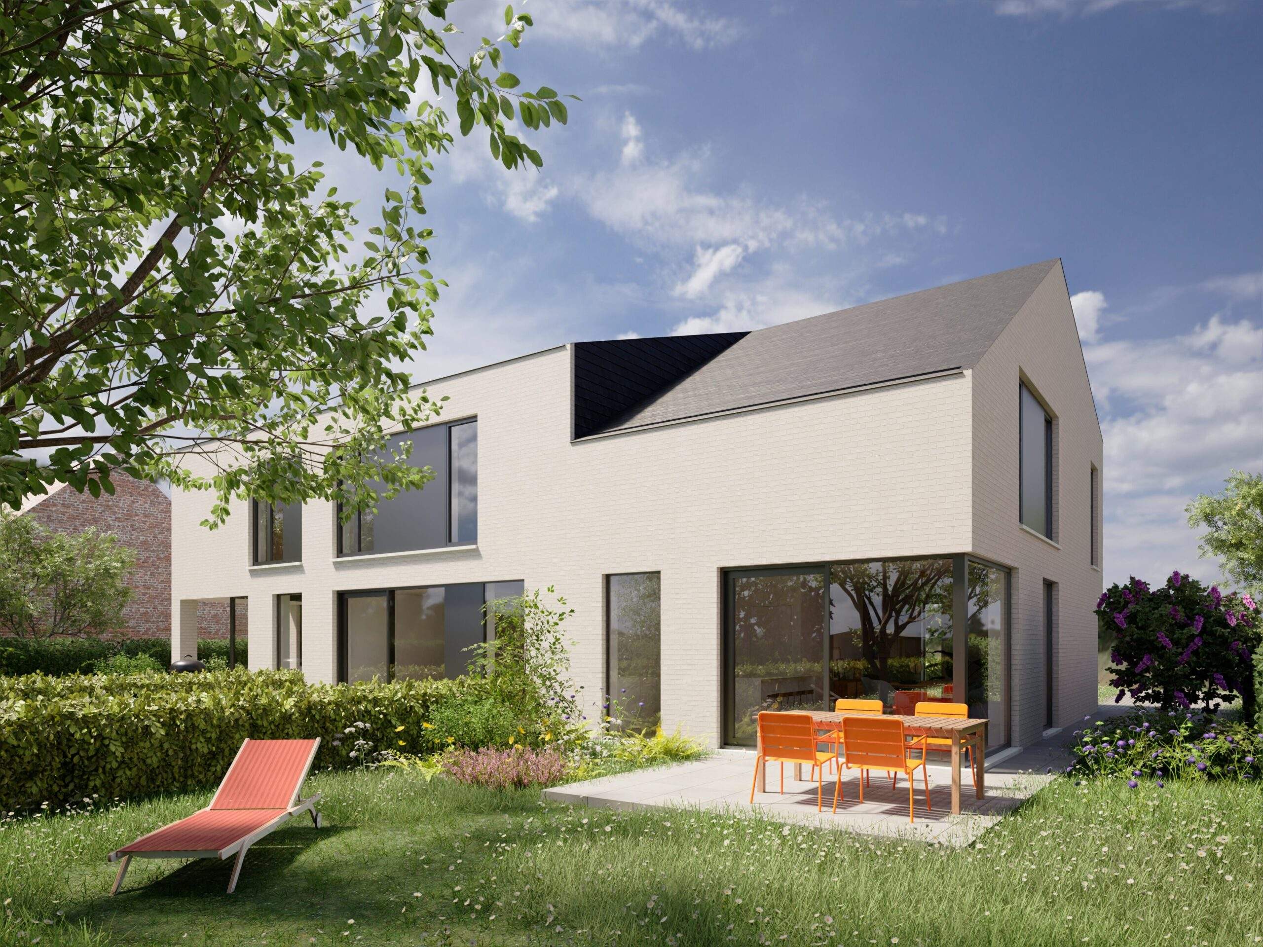 Dit project bestaat uit 2 halfopen bebouwingen en één gesloten bebouwing, gekenmerkt door zijn moderne architectuur. De indeling is uiterst praktisch en haalt het maximale uit de woonst. Via de inkomhal met apart gastentoilet kom je in de ruime leefruimte. Let hier op de diagonale zichtassen en het grote schuifraam richting de zuidgerichte tuin. Een fijne open keuken maakt het geheel af. Vanuit de gezelligheid van de zitruimte neemt de trap je mee naar de verdieping. Je vindt er 3 slaapkamers, berging en de badkamer met wastafel, bad en inloopdouche. De woningen zullen beschikken over zonnepanelen, vloerverwarming en een warmtepomp.